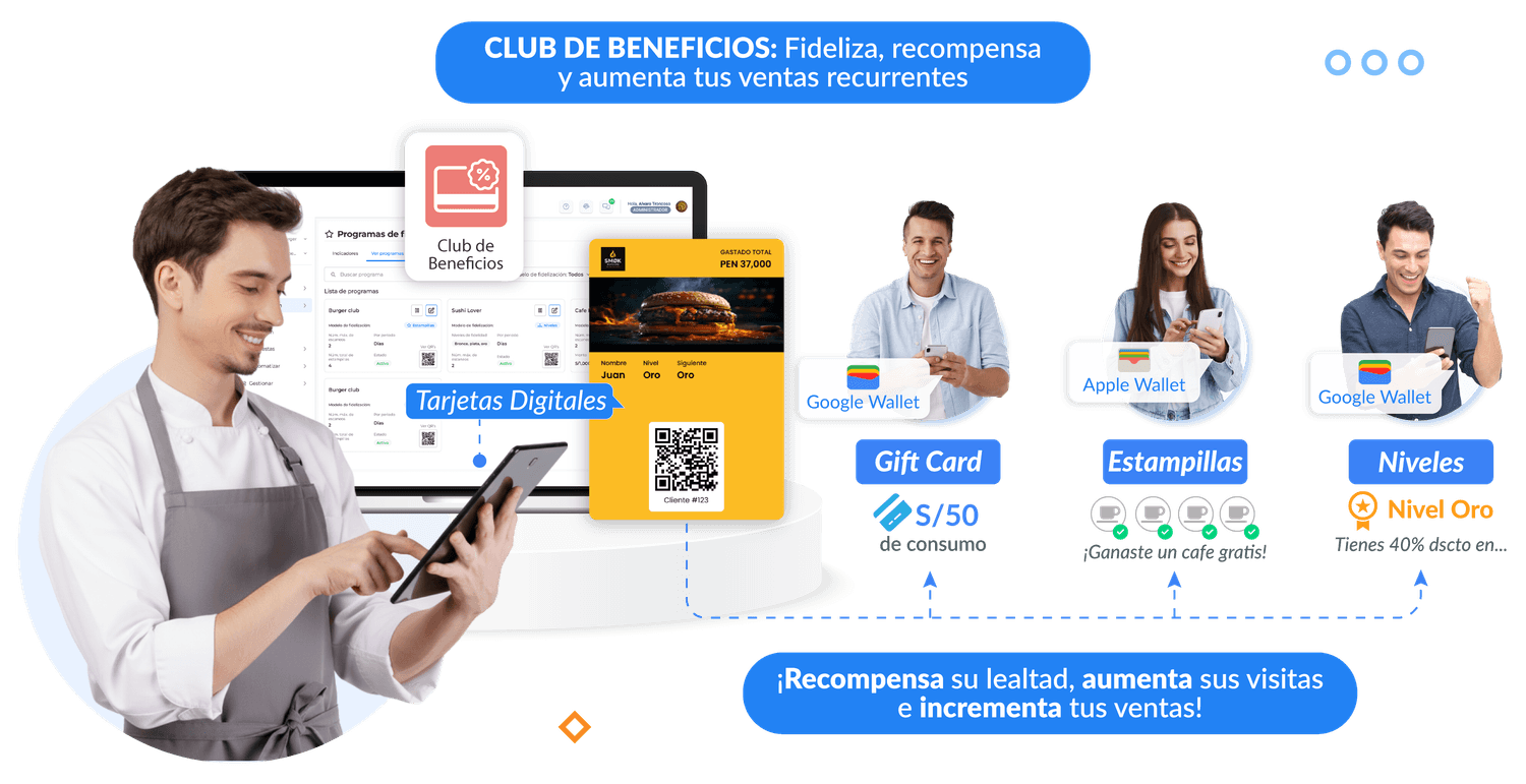 El Club de Beneficios de Restaurant.pe está diseñado justamente para eso: transformar clientes ocasionales en clientes fieles. Ya no hablamos de tarjetas físicas que se pierden o cupones olvidados; todo vive en el celular del cliente, dentro de Google Wallet o Apple Wallet. Con un simple QR, el mesero valida la tarjeta y el beneficio queda registrado al instante.